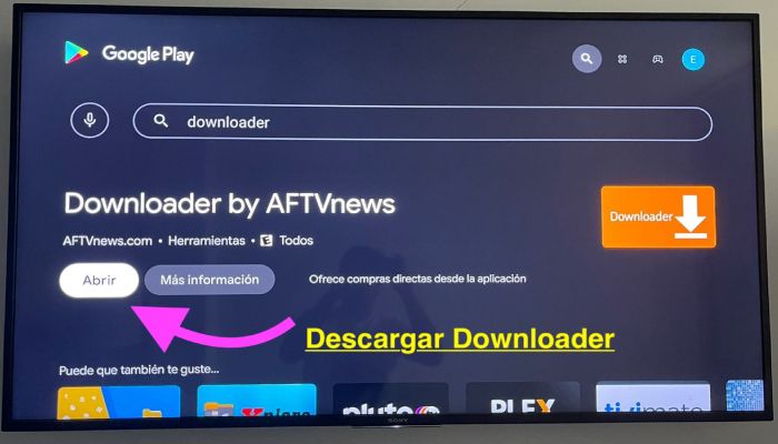 Primero, vamos a encender nuestro SmarTV con Android, ingresaremos a la PlayStore, buscaremos "Downloader", y descargaremos la app correspondiente: